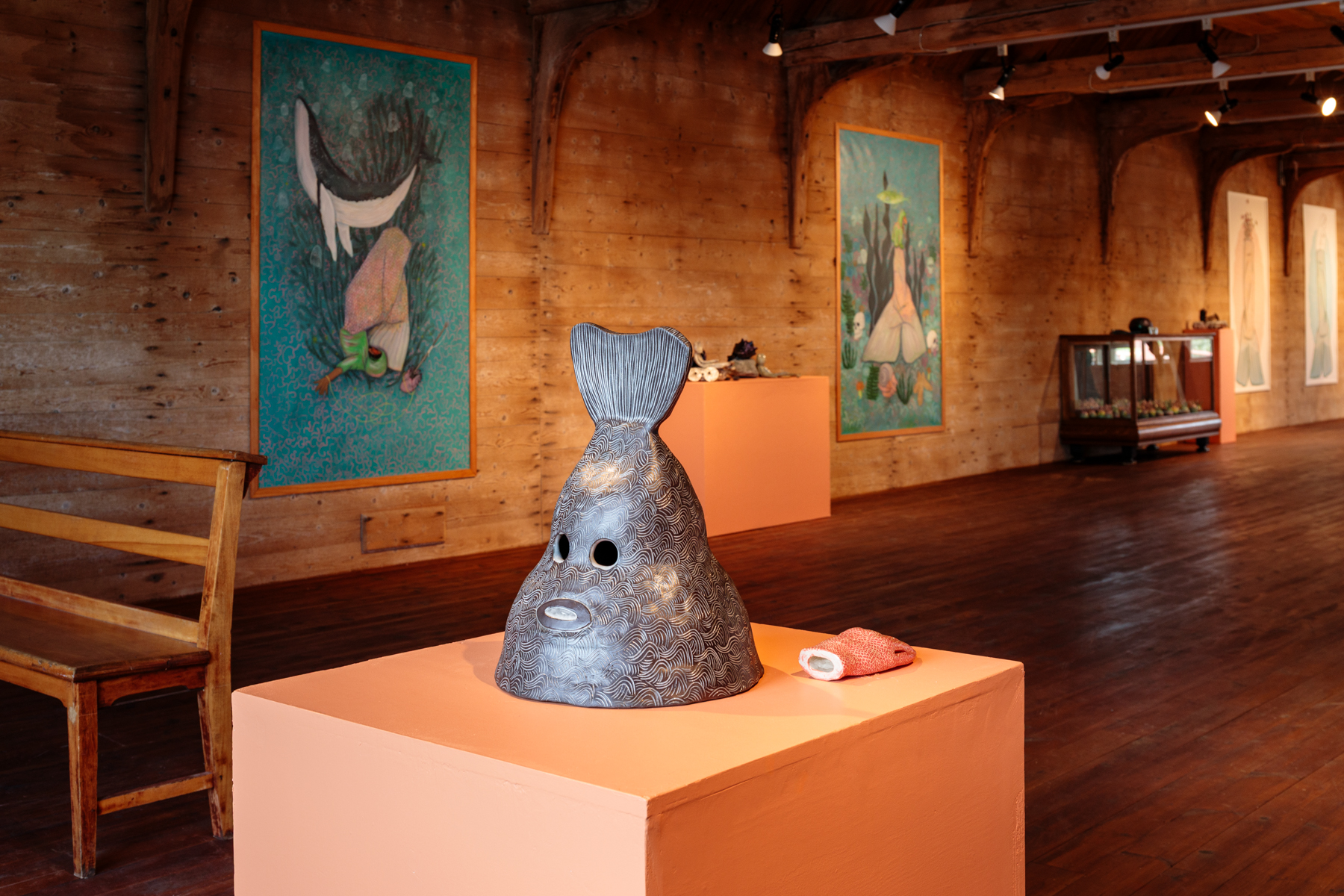Dans cette exposition conçue en dialogue avec Percé et le Musée du Chafaud, je m’appuie sur la mémoire sensible de ce lieu patrimonial — ancien séchoir à morue salée — pour l’entrelacer aux territoires qui nourrissent ma pratique : la Gaspésie, la Norvège, le Nunavik et les rives du fleuve Charente où j’ai grandi. Ce corpus multidisciplinaire pensé pour le musée cherche à faire vibrer ensemble lieux, mémoires et imaginaires, en écho aux récits maritimes qui traversent les cultures nordiques et littorales.