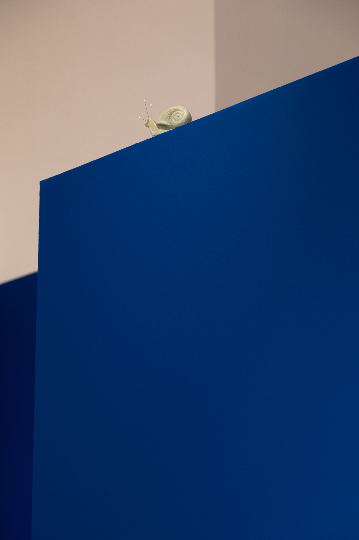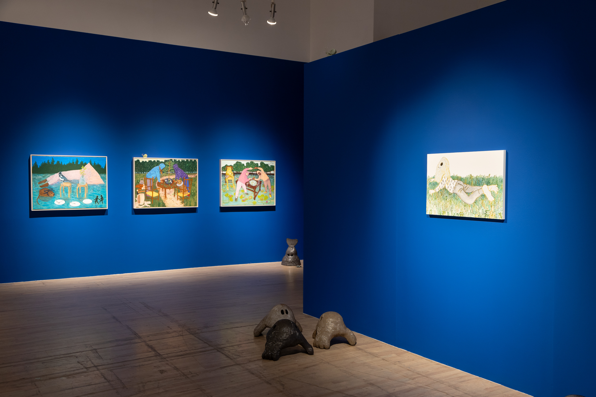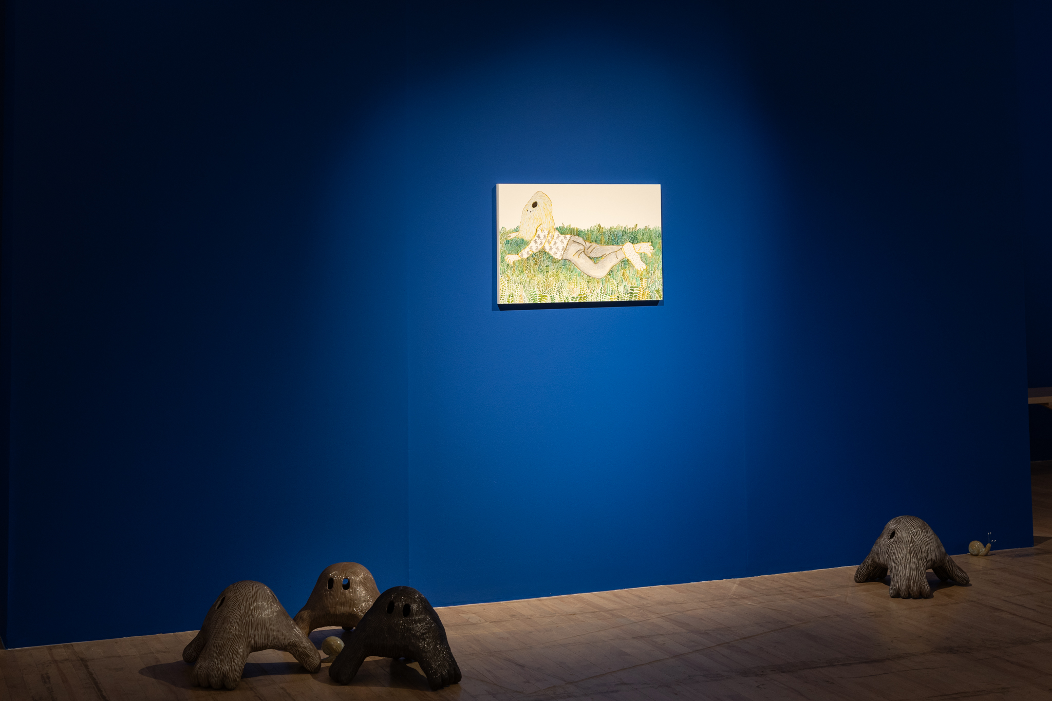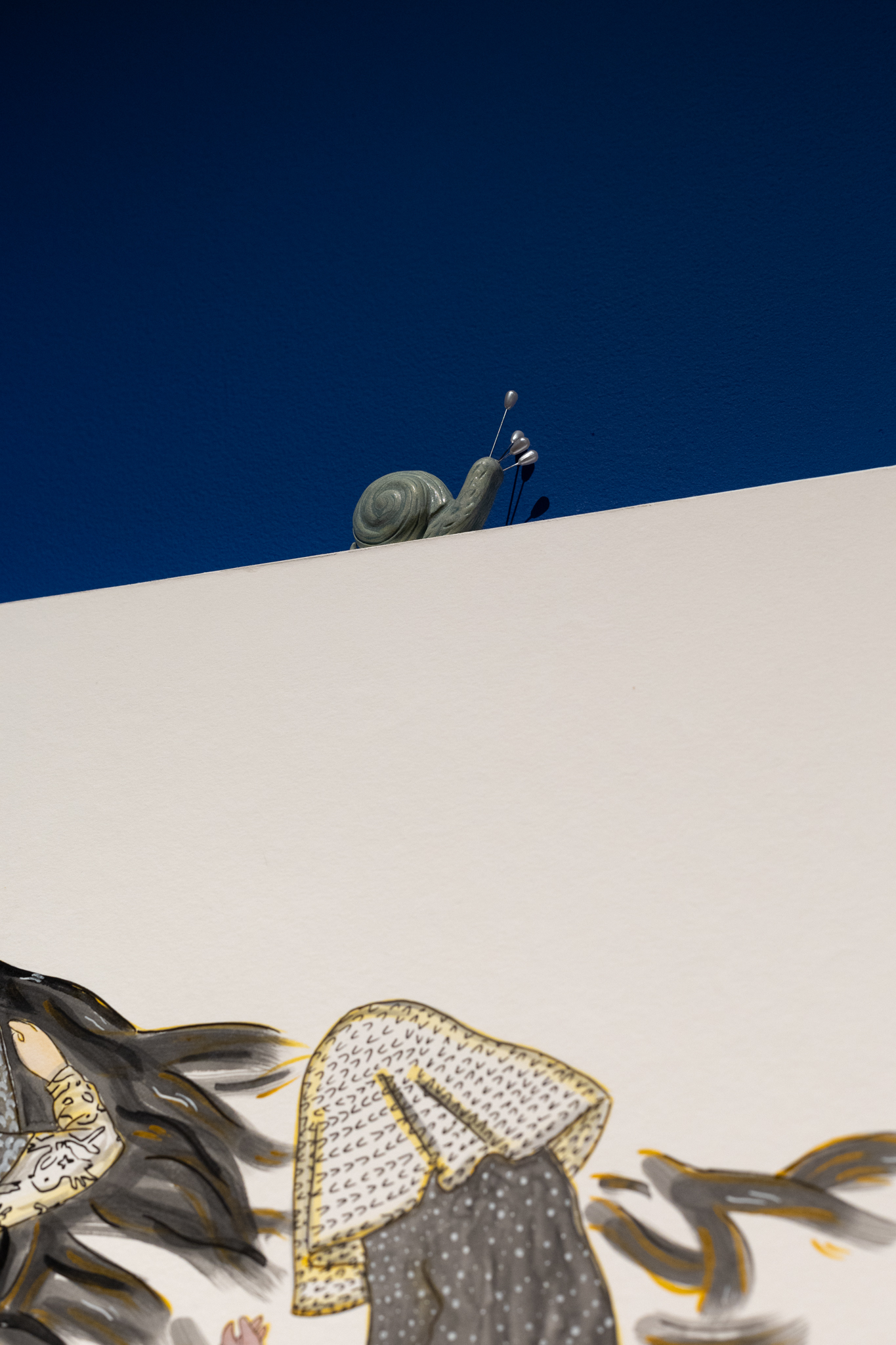 Fanny Mesnard construit une trame narrative à partir de motifs récurrents (escargots, nénuphars, tables, mains, hoodie, etc.) et inspirés de contes revisités d’où surgissent des créatures liminaires qui explorent les lieux en prenant des postures incongrues. Sont-elles en train de danser ? Sont-elles occupées à un rituel ? Créant ses personnages en prenant soin d’ouvrir leurs sens, l’artiste nous invite à voir le monde sous d’autres angles, à imaginer comment ils pourraient vivre sur de nouveaux territoires. À vous maintenant de prendre part au parcours proposé dans ce lieu d’exposition métamorphosé en devenant, à votre tour, une partie de ce récit vivant. »