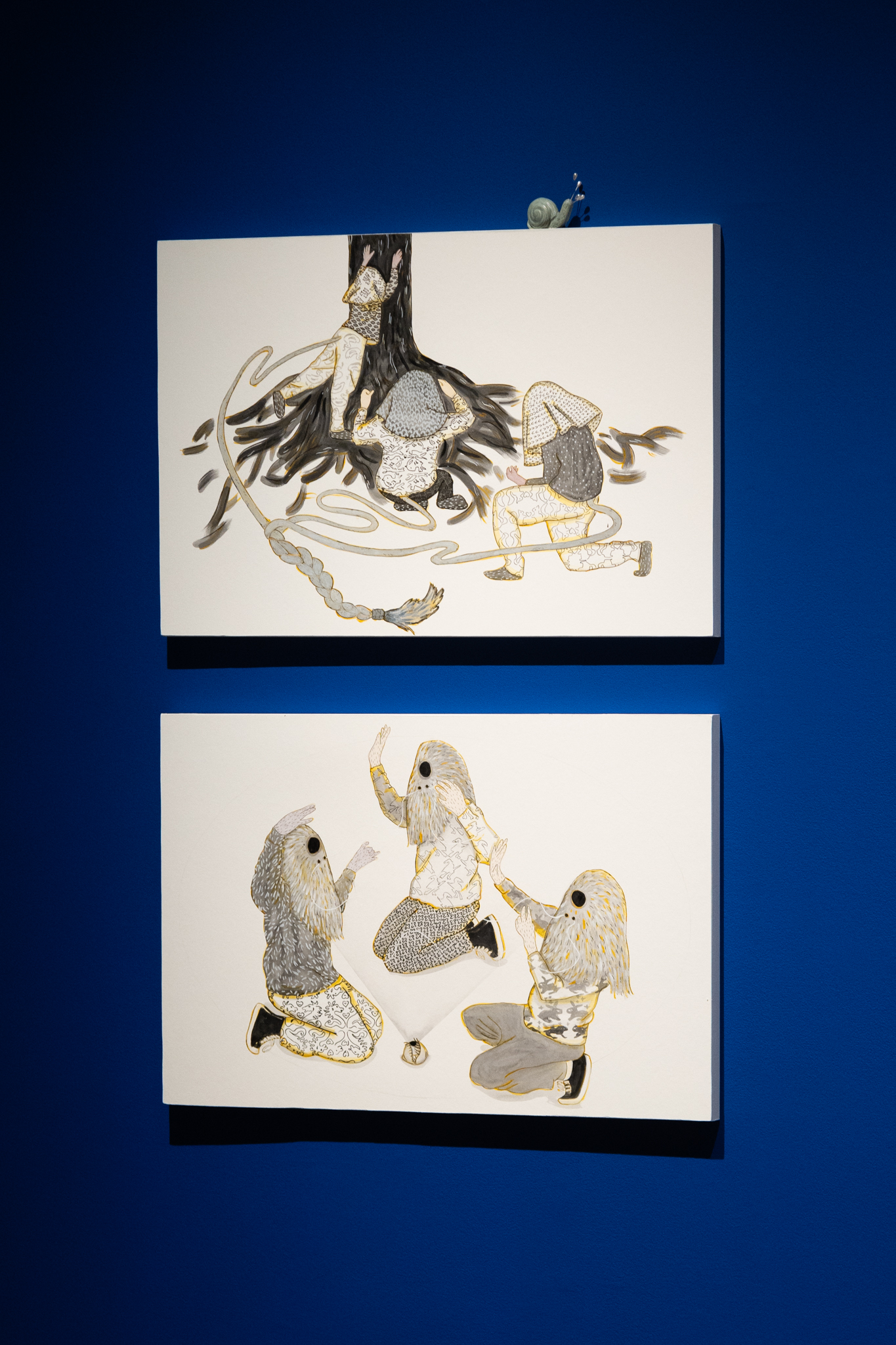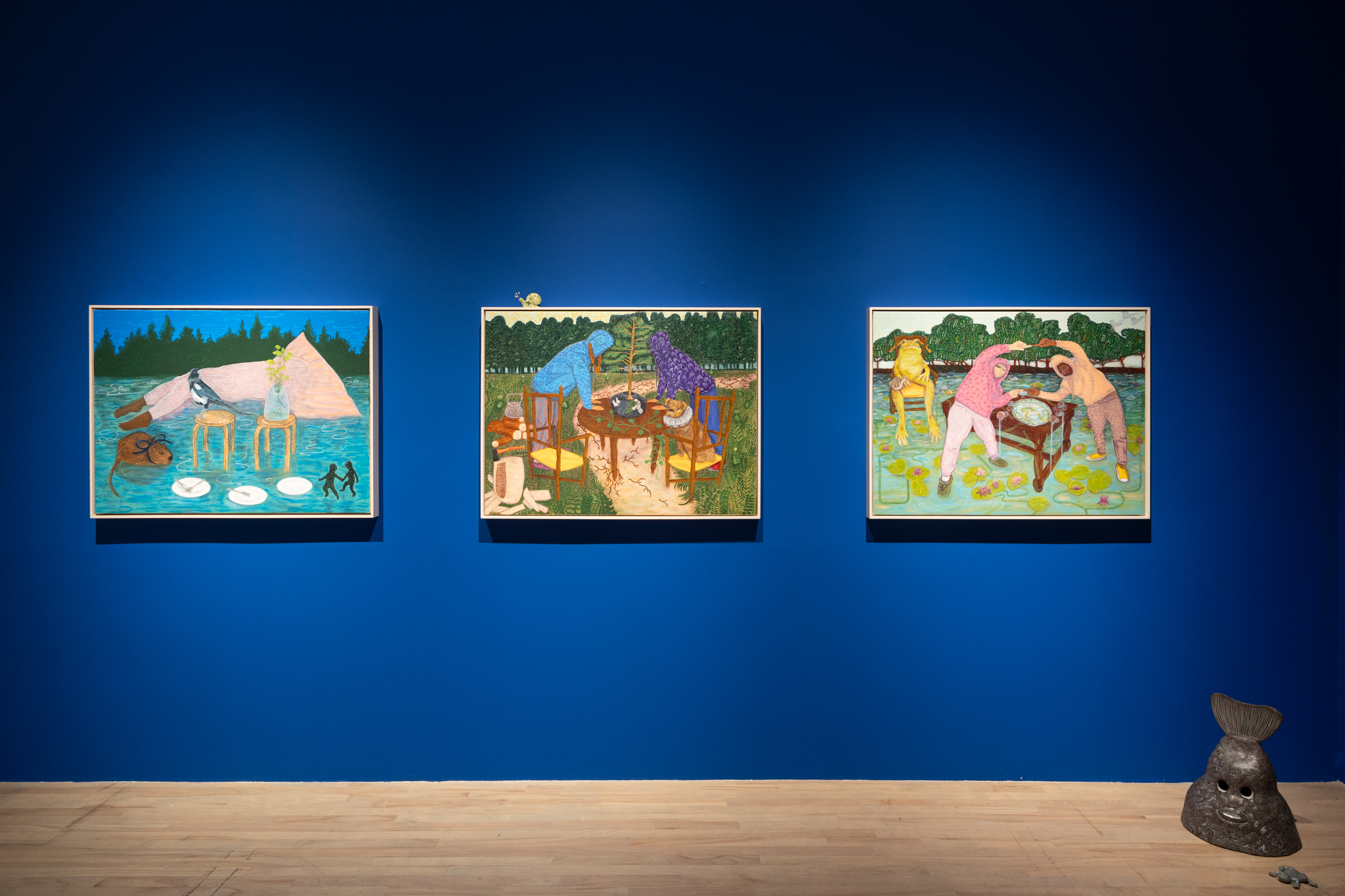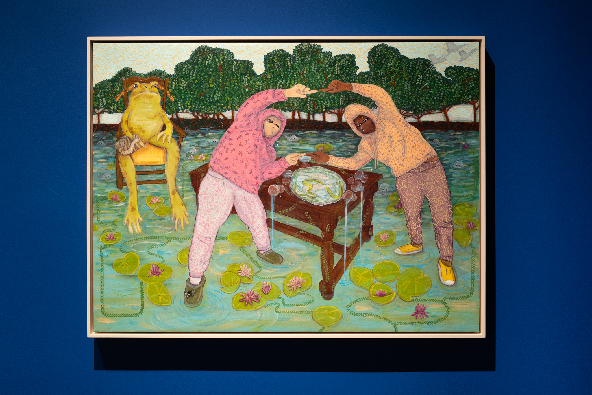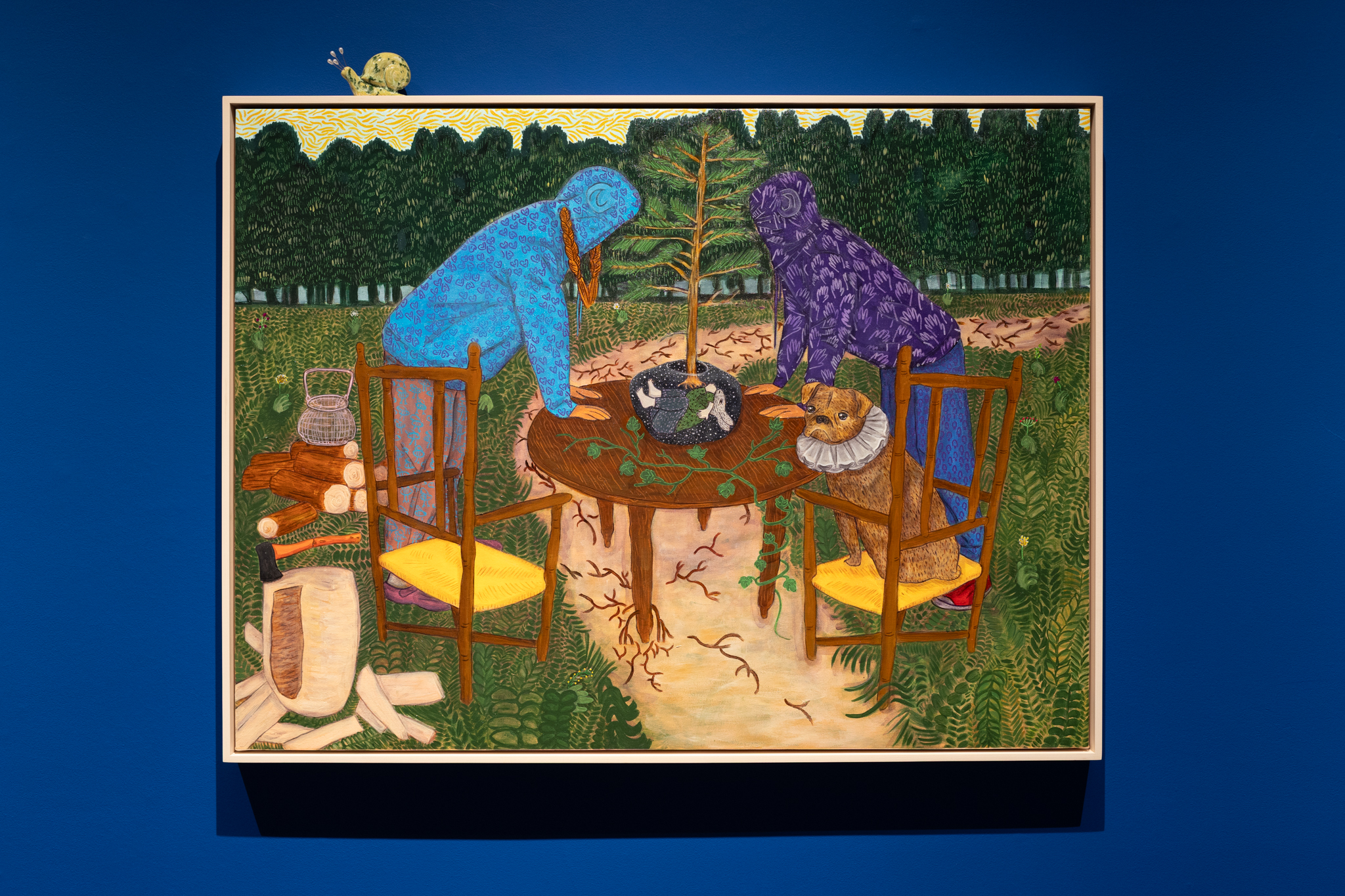 Fanny Mesnard construit une trame narrative à partir de motifs récurrents (escargots, nénuphars, tables, mains, hoodie, etc.) et inspirés de contes revisités d’où surgissent des créatures liminaires qui explorent les lieux en prenant des postures incongrues. Sont-elles en train de danser ? Sont-elles occupées à un rituel ? Créant ses personnages en prenant soin d’ouvrir leurs sens, l’artiste nous invite à voir le monde sous d’autres angles, à imaginer comment ils pourraient vivre sur de nouveaux territoires. À vous maintenant de prendre part au parcours proposé dans ce lieu d’exposition métamorphosé en devenant, à votre tour, une partie de ce récit vivant. »