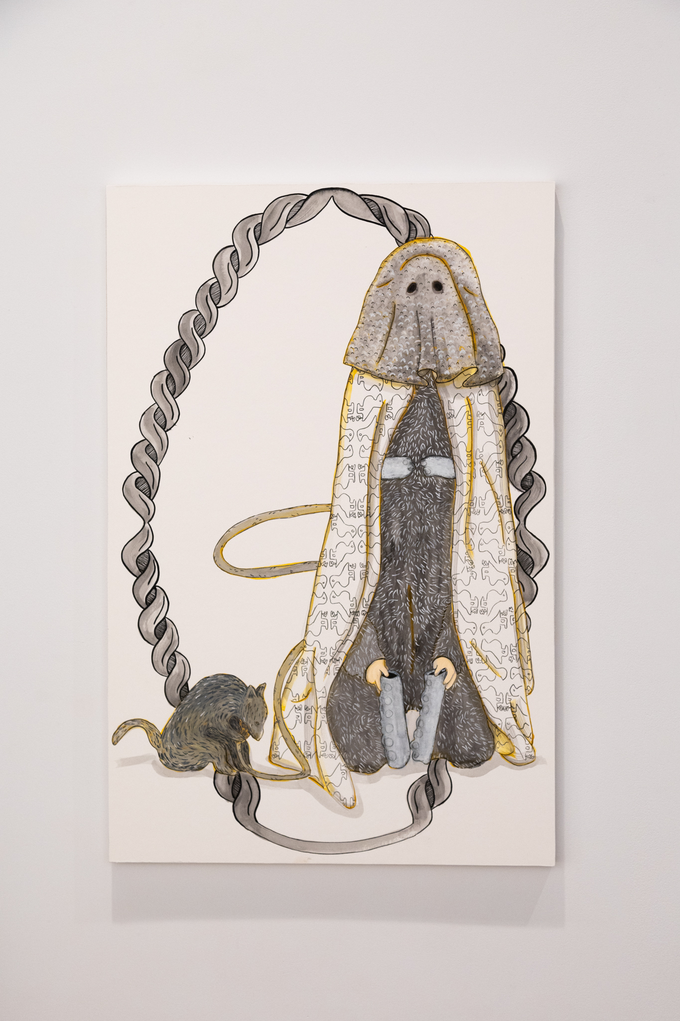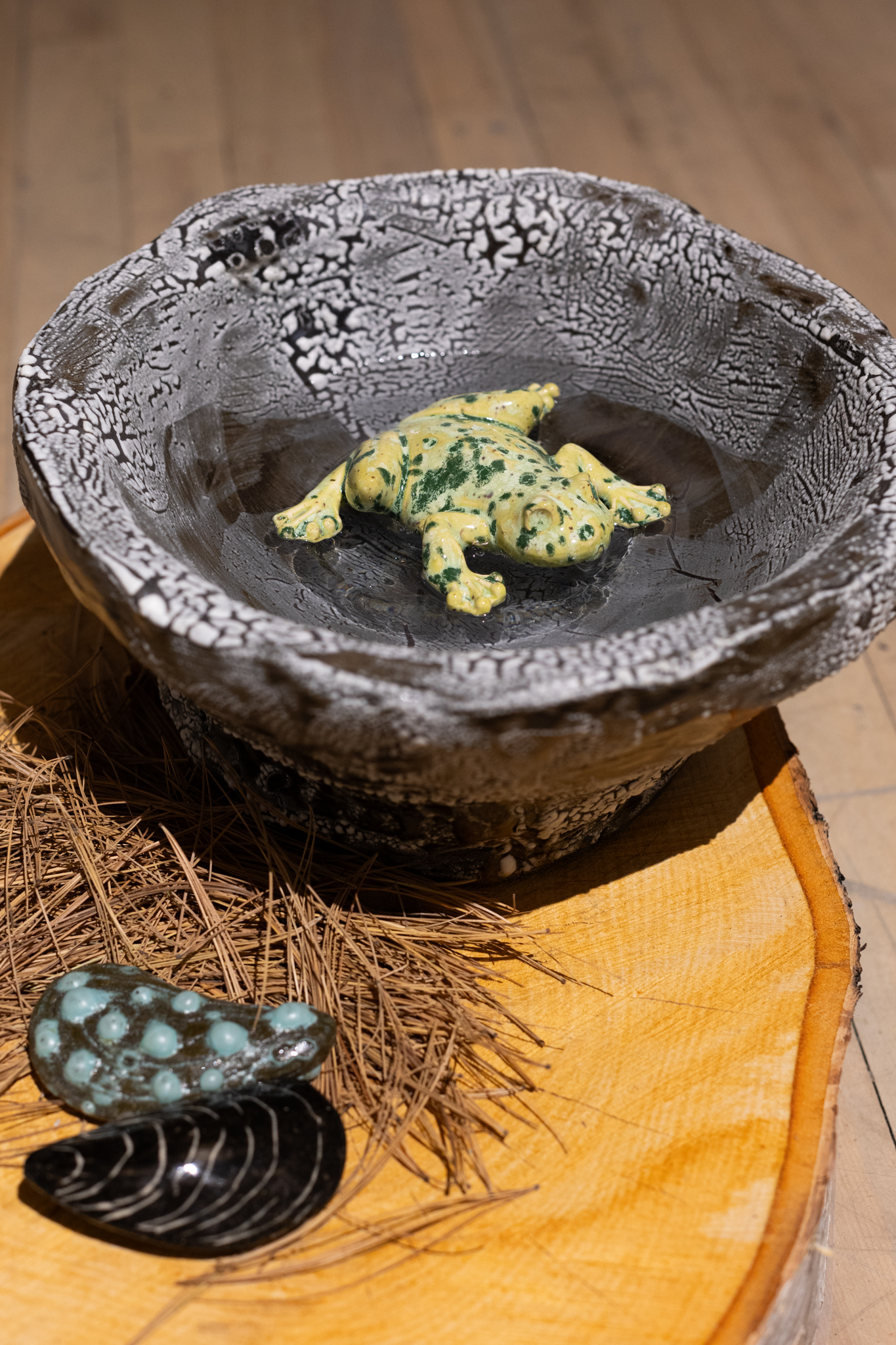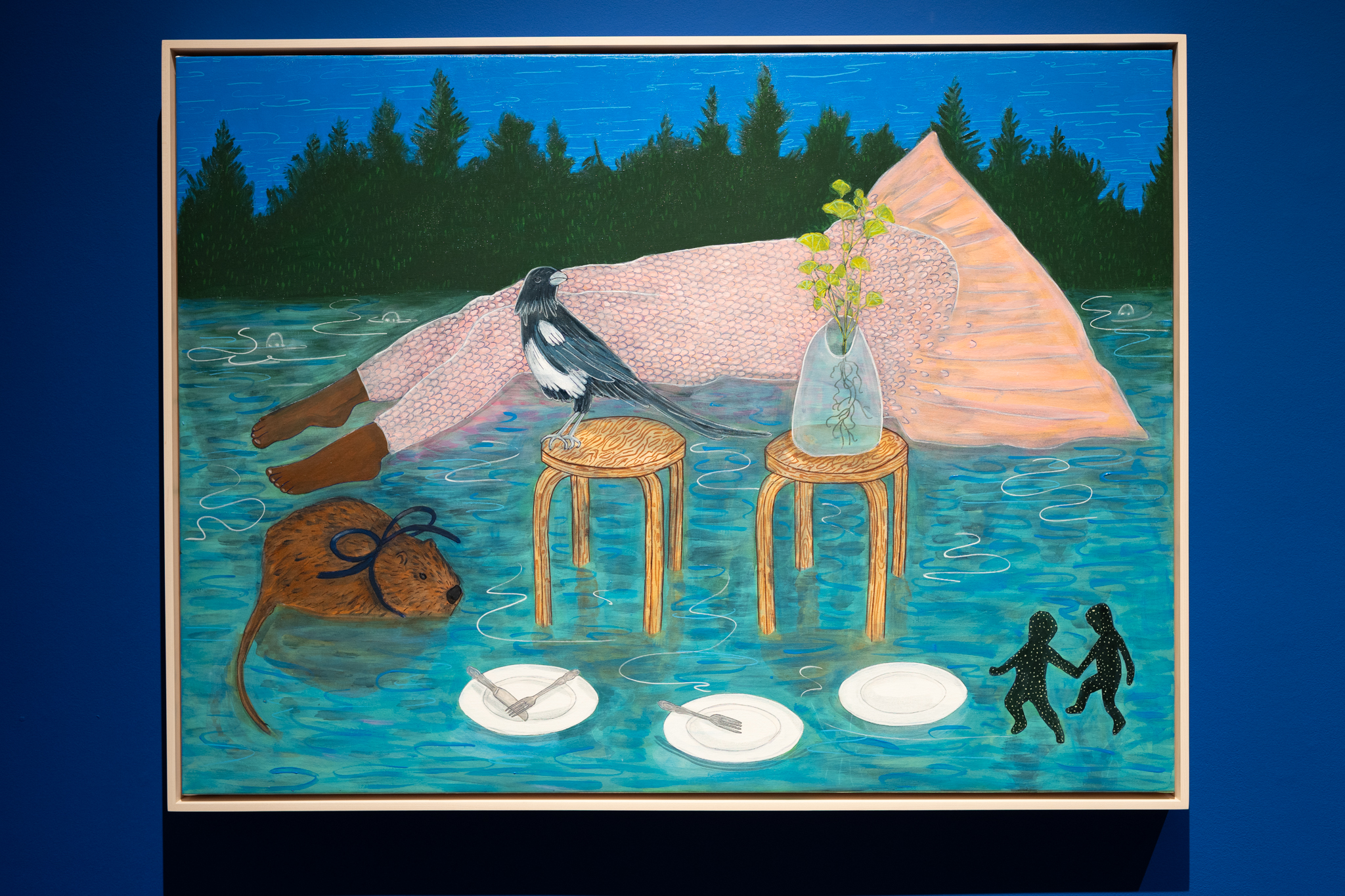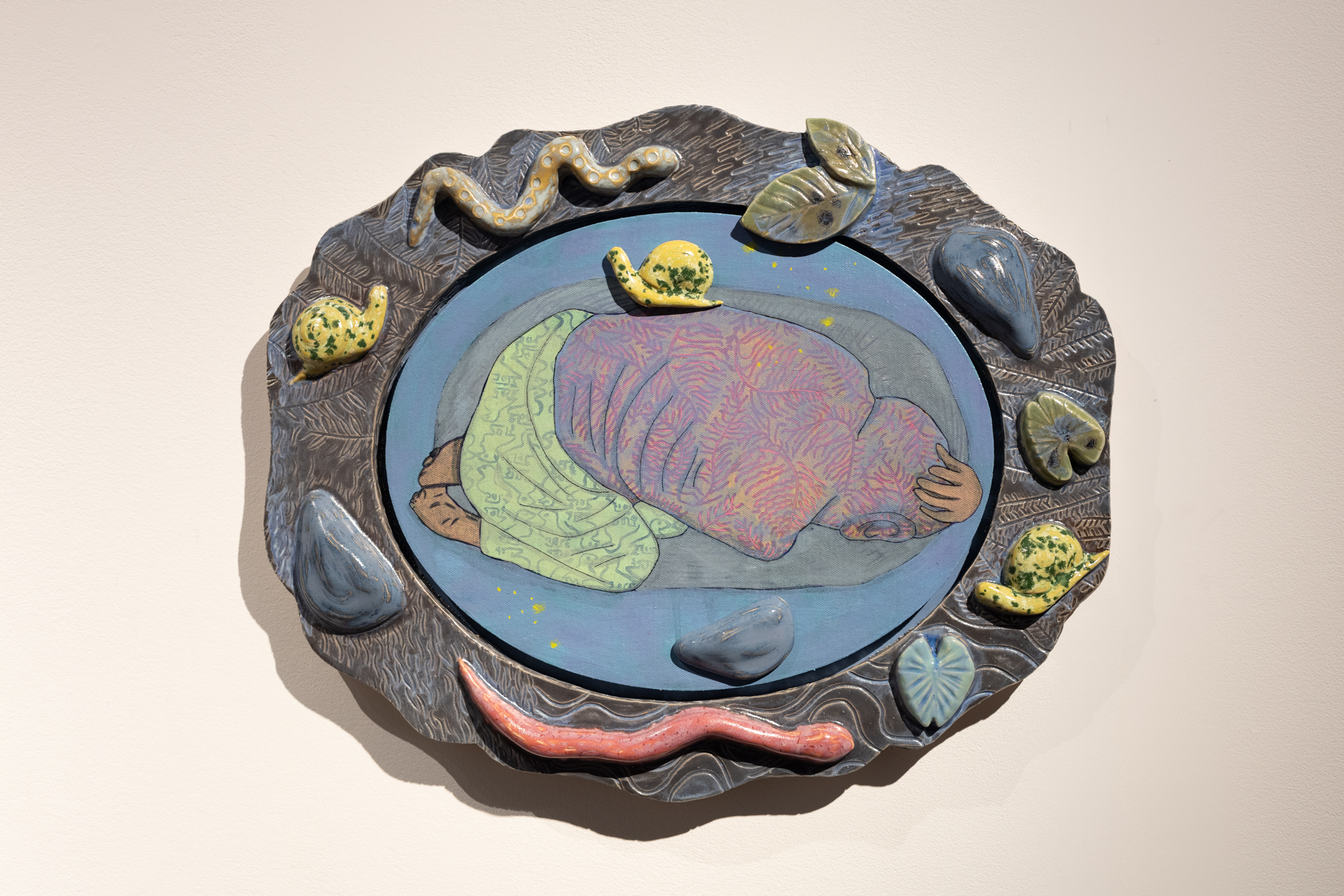 Fanny Mesnard construit une trame narrative à partir de motifs récurrents (escargots, nénuphars, tables, mains, hoodie, etc.) et inspirés de contes revisités d’où surgissent des créatures liminaires qui explorent les lieux en prenant des postures incongrues. Sont-elles en train de danser ? Sont-elles occupées à un rituel ? Créant ses personnages en prenant soin d’ouvrir leurs sens, l’artiste nous invite à voir le monde sous d’autres angles, à imaginer comment ils pourraient vivre sur de nouveaux territoires. À vous maintenant de prendre part au parcours proposé dans ce lieu d’exposition métamorphosé en devenant, à votre tour, une partie de ce récit vivant. »