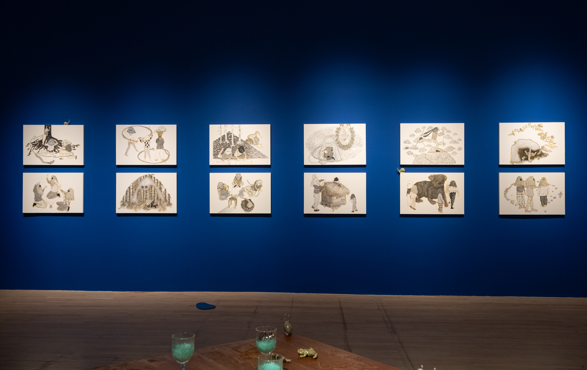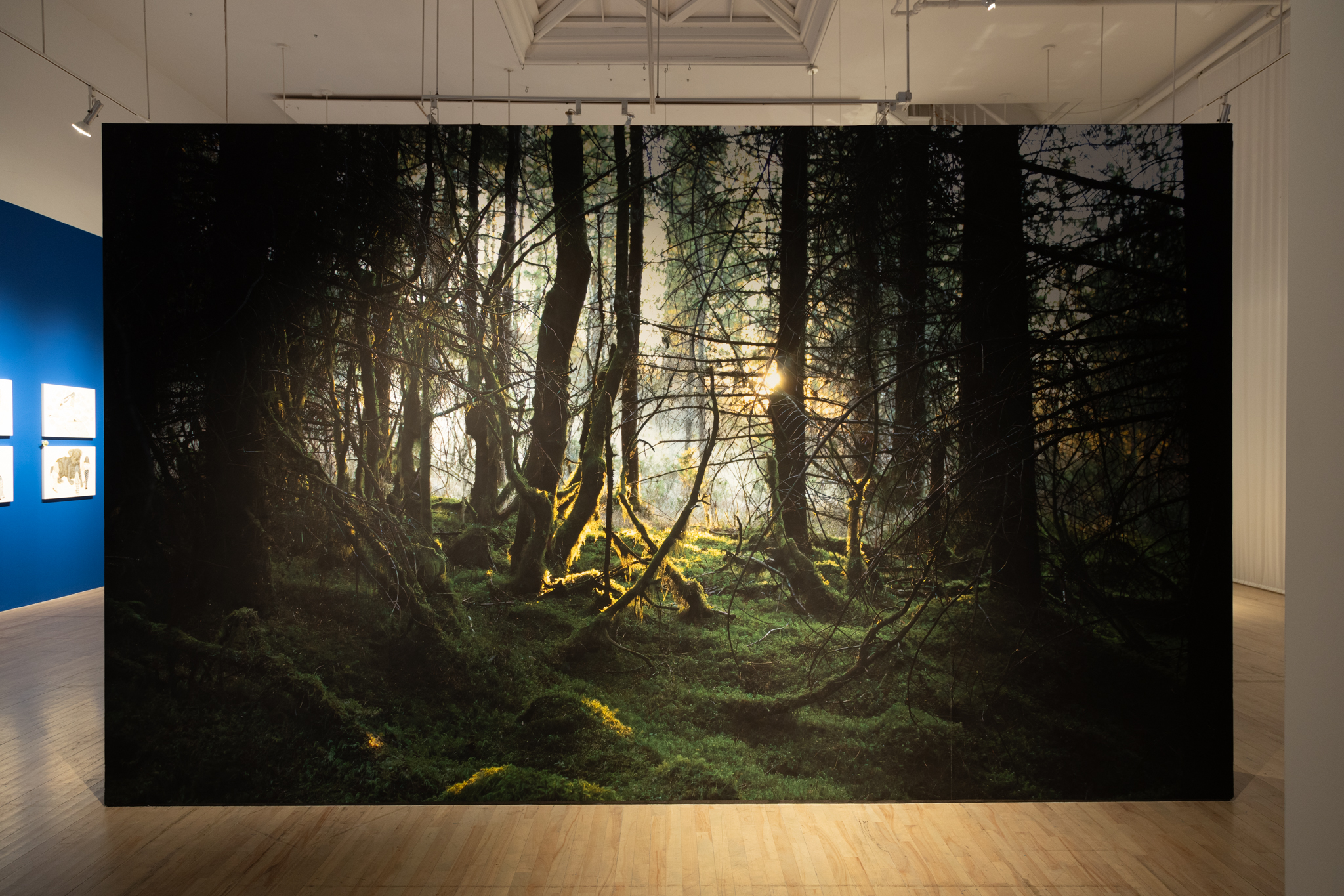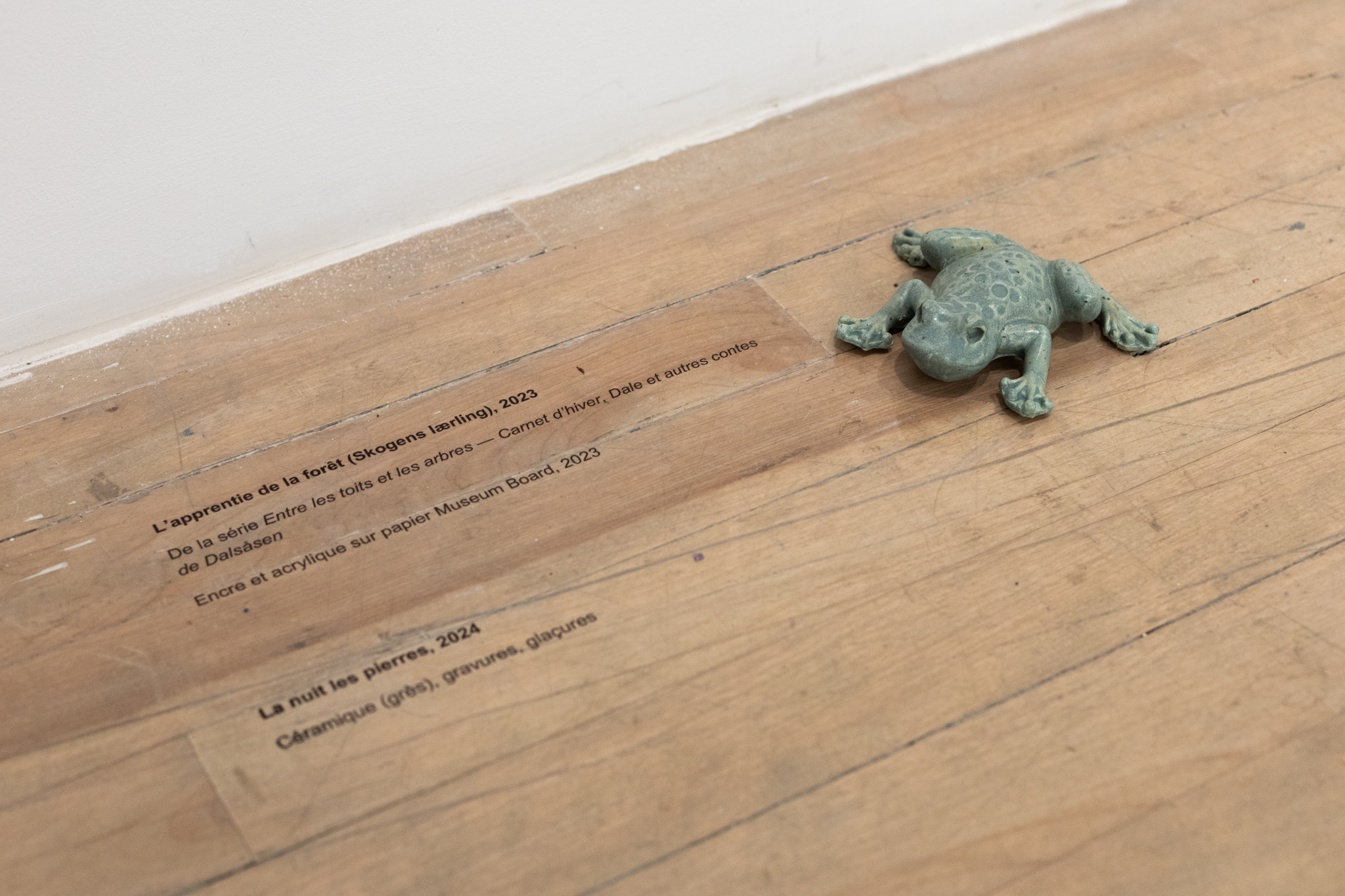 « Dans ce nouveau corpus, l’artiste s’inspire de ses récents voyages en Norvège, dans le Nord du Québec et en Charente, son lieu de naissance. Apparemment différents, ces territoires ont offert la matière d’un nouveau monde à cartographier. Sur place, elle s’est nourrie de ses observations sur le terrain, de ses promenades en forêt de jour comme de nuit, de la flore qu’elle découvre, des motifs repérés sur des vêtements traditionnels ou de ses lectures de contes et légendes qui expriment un imaginaire collectif. Elle tisse des liens entre ces fragments de territoires en les intégrant à ses œuvres : dessins, peintures, sculptures céramiques, performances, créations textiles, photographies et vidéo.